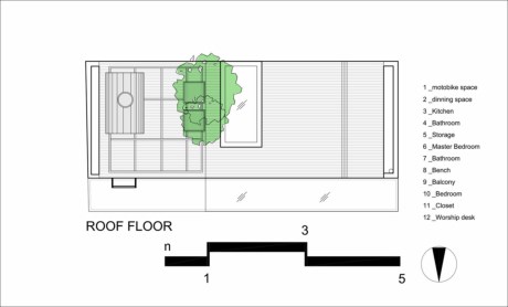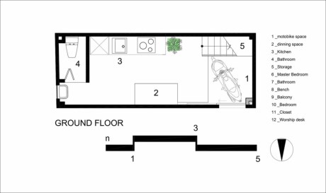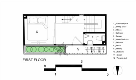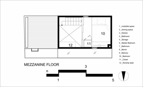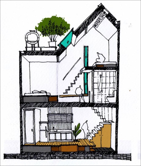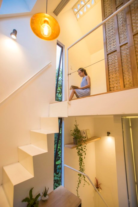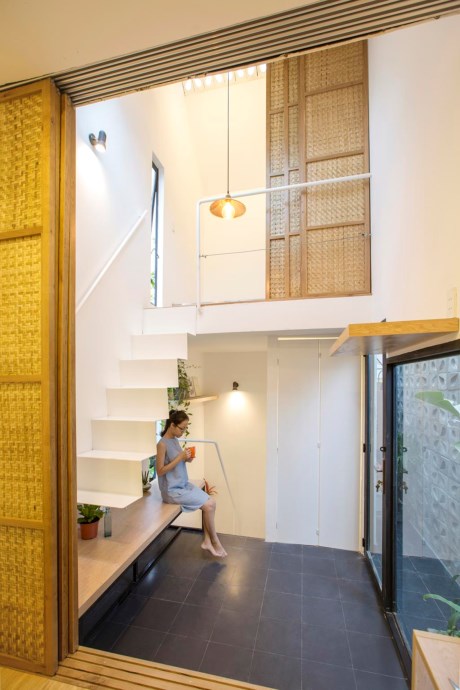 Tuy không gian có diện tích nhỏ, dài và hẹp nhưng lại tạo cảm giác thông thoáng.Tầng hai và tầng lửng có hai phòng ngủ dành cho bố mẹ và những đứa trẻ tương lai. Ý tưởng nội thất được thiết kế mở nhằm mục đích tạo cho phòng ngủ có điều kiện ánh sáng tốt và thông gió, cùng với đó là việc “cơi nới” diện tích thật. Không gian riêng tư được bao bọc bởi cánh cửa trượt bằng tre linh hoạt. Trong phòng ngủ, lại một lần nữa, phần sàn được nâng lên để lại không gian cho việc lưu trữ bên dưới và toàn bộ diện tích đất trống ở trên. Tất cả những yếu tố trên đã làm cho không gian ấm cúng này có vẻ rộng và thoáng mát hơn nhiều.